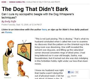 Emily Yoffe, the reigning Guinea Pig, has entered a Matzoh ball eating contest, visited a nudist colony, and trained her dog using nothing but tips from The Dog Whisperer. Doesn’t this all sound like a ton of fun?