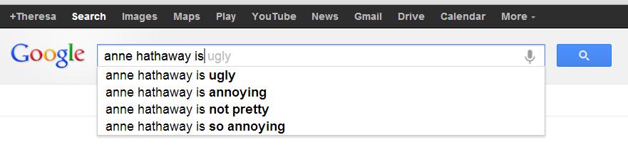 Now, I don’t necessarily agree with Google that Hathaway is ugly — because, well, she’s not — but she does strike me as a big phony baloney. Which brings me to Jennifer Lawrence. Now, I don’t want to pit two young actresses against each other, but let’s be real… neither of them will ever see this… so whatevs…